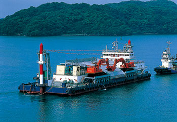 |  | 本船は、混気圧送方式により広範囲の浚渫砂質粘度、砂質土等の圧送が可能であり、また揚土に混入する礫もクラッシャーで破砕し圧送することもできる。時間当たり1,000m³の圧送能力を有し、高度な施工管理システムを備えている。