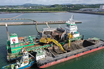 |   | 本船は、軟泥から岩塊までの広範囲の土質を高濃度で長距離圧送する国内最大級(1,000m³/h)の空気圧送船である。また、空気量の調整により土質・排送距離に応じた連続圧送を実現し、軟泥に対しては固化材の定量添加ができ、均質強度にする固化処理圧送にも対応可能である。