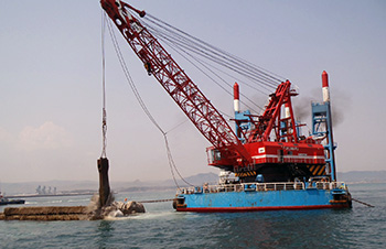 本船は、日本最大級の55t砕岩棒2本と、容量比12.7のウルトラヘビーパケットを装備し岩盤の破砕作業だけでなく、ケーソンなどコンクリート構造物取り壊し作業をより安全に効率よく行なうことができる。