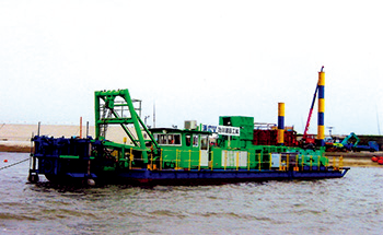 水底に堆積した各種汚染物質を含む泥土(堆積汚泥)を、各種ポンプを使用して吸い上げ、管路で処分地まで排送する浚渫船。