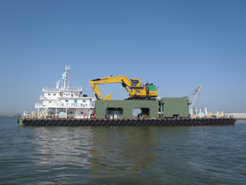 本船はGPS 測位システムとオートレッドによる施工管理システムにより、正確な土砂投入が可能であり、水面下約23m まで伸縮可能なトレミー管により大水深での施工が可能である。