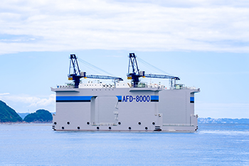 「AFD-8000」は操作性の向上及び省力化の機能を加えて新たに建造したケーソン製作用台船である。本船はWi-Fi 通信による係留装置、バラスト注排水の遠隔操作や無線通信によるクレーンの遠隔操作を実現しており、従来と比べて高い利便性を持っている。また、超音波流量計を利用した「燃料見える化システム」を導入し、CO2 削減に取り組んでいる。更に近年の「働き方改革」への対応として、女性専用室及び充実した居住設備を設け、職場環境の向上を図っている。