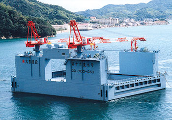 防波堤、岸壁等に使用される大型コンクリートケーソンを安全、確実に製作し進水させる台船。フローティングドック型、ドルフィンドック型がある。