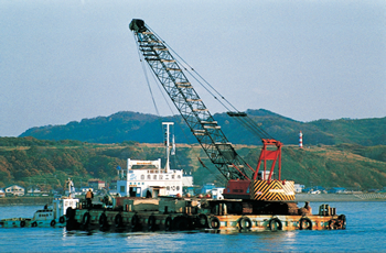 本船は、留萌管内の港湾施設の整備に伴う港湾工事に応えるために建造した中型のクレーン付台船で、クローラークレーンを装備し各種建設用資材の搬出入をはじめとした、テトラポット、ブロック、大割石、漁礁等の設置及び浚渫船として各種の港湾工事に従事しています。
