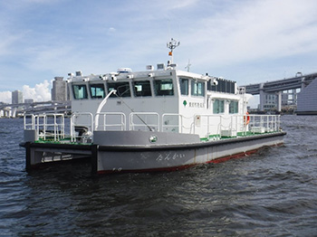 測量船「たんかい」は、既存船の老朽化に伴い令和5年度に新たに建造したものであり、東京港内の航路・泊地等の深浅測量を定常的に実施している。船首にはマルチビーム測深機を搭載しており、扇状に発振する音波によって海底状況を把握し浚渫事業等に活用している。