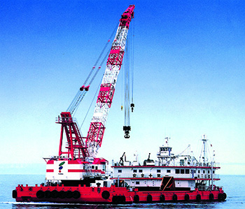高機能を装備し、機動力と安全性の向上を図り海上起重作業に従事する押航式起重機船210t 吊、6m³ グラブ装備。